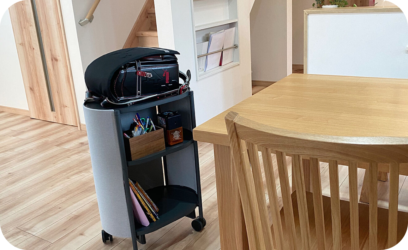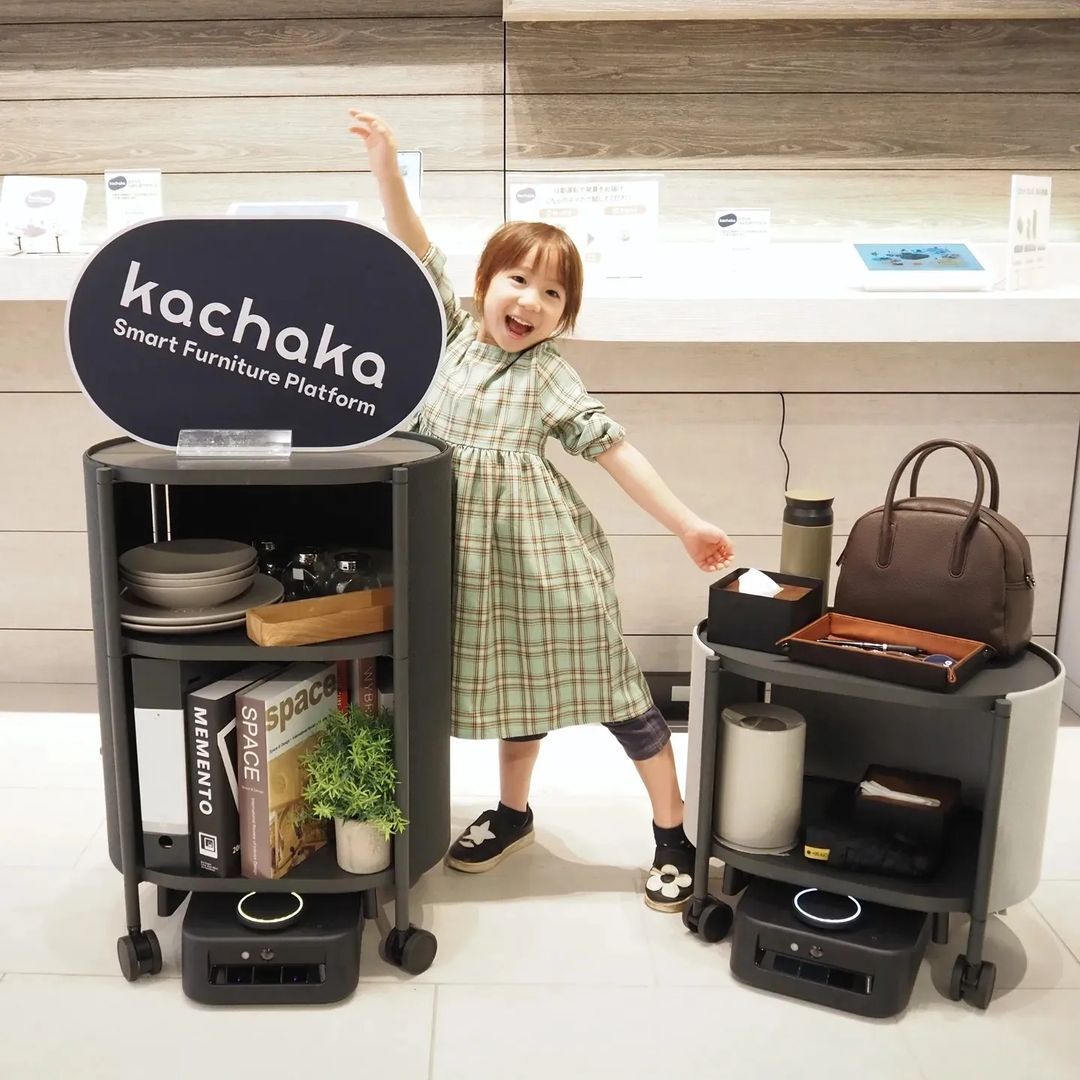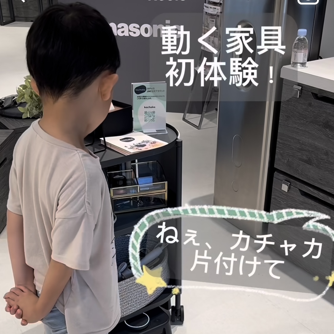 スマートファニチャーKachaka (カチャカ) 先行モニター中です♪ ダイニング学習の息子に📝 シェルフにはランドセルや文具を乗せてます🎒 子ども達は自動で動くカチャカに興味深々!