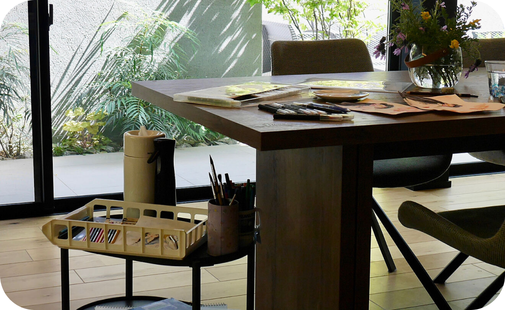 すぐ使わないアイテムはまとめて収納へ。使う時だけ手元に呼び出す。広々とした机で、集中して作業できるように。