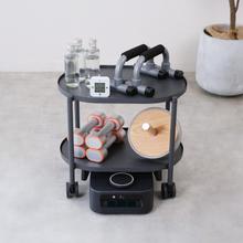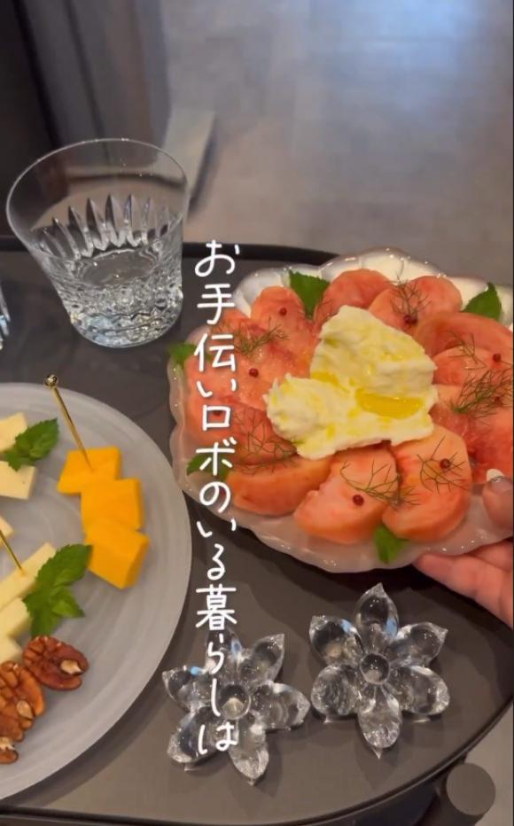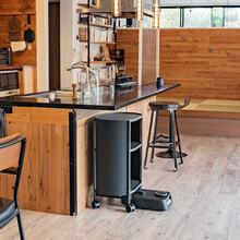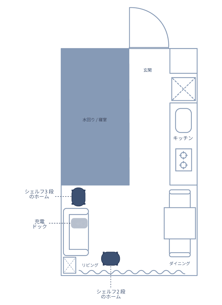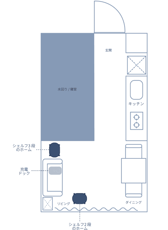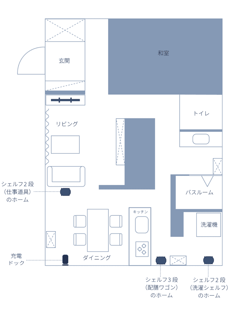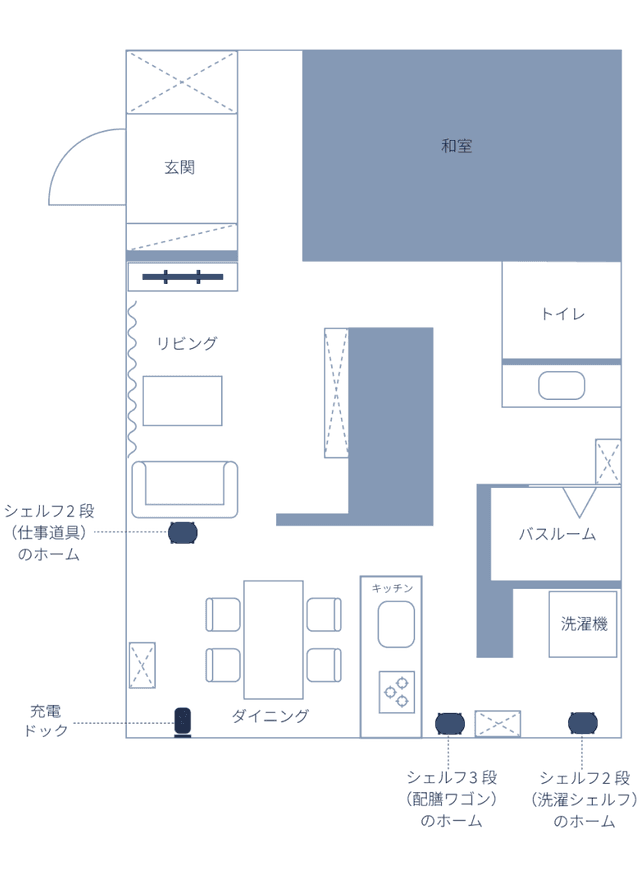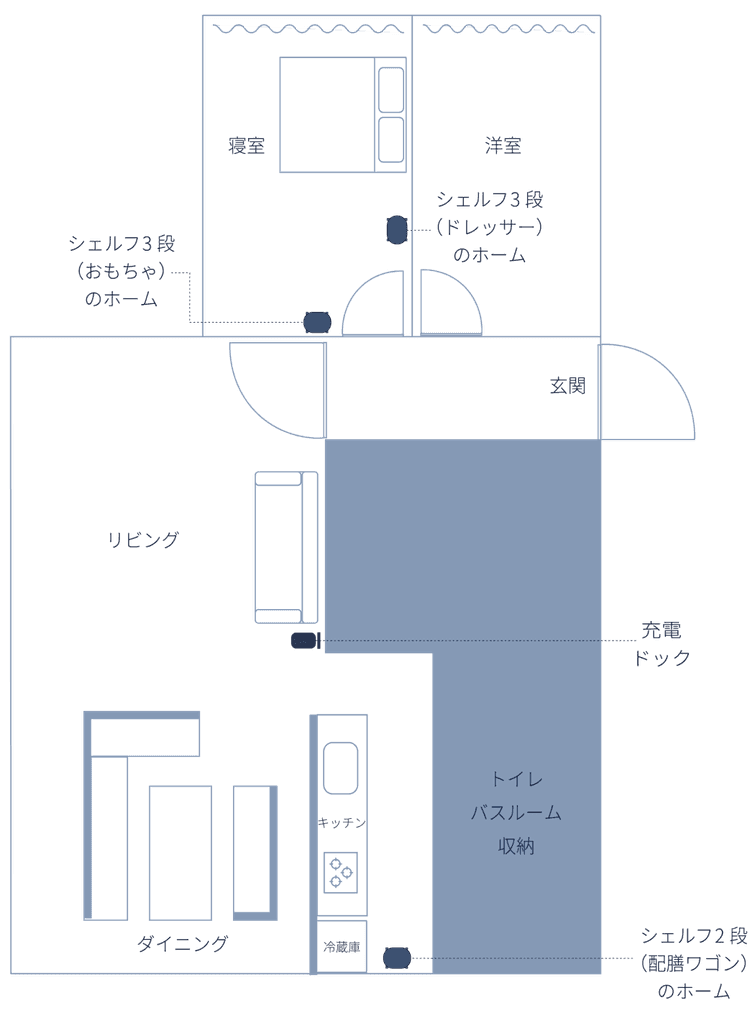 ベビのおもちゃ・絵本シェルフ、私のコスメシェルフは頼んだら運んできてくれるし、配膳時も定刻にキッチンにきてくれて載せたら一気にテーブルへ運んでくれるから楽🥰